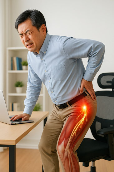 「お尻から脚にかけてズキズキ痛い」「ふくらはぎまでしびれる」 こうした症状があると、多くの方は坐骨神経痛を疑います。確かに坐骨神経は腰からお尻、脚の後面を通る大きな神経で、このルートに沿った痛みが出ることが多いです。しかし実際には、坐骨神経そのものだけでなく、周囲の筋肉や神経の働きが原因となっているケースも少なくありません。 代表的な原因には以下のようなものがあります。 1. 腰椎由来の神経圧迫 椎間板ヘルニアや腰部脊柱管狭窄症では、腰の神経根が圧迫され、坐骨神経に沿って痛みが放散します。 2. 梨状筋症候群 お尻の奥にある梨状筋が硬くなると、その下を走る坐骨神経を圧迫し、お尻から脚へ強い痛みを引き起こします。 3. 小臀筋トリガーポイント 意外と多いのがこのケースです。お尻の奥にある小臀筋にできた「トリガーポイント」と呼ばれる硬結が、大腿外側からふくらはぎにかけて関連痛を生じさせます。検査では異常が見つからないのに痛みが続く方は、このパターンが疑われます。 4. 血流障害や長時間の座位 デスクワークや長時間の運転などで筋肉の血流が低下すると、神経への酸素供給が不足し、痛みやしびれを悪化させることがあります。 お尻から脚にかけての痛みは、一見すると同じように見えても、原因は人によって異なります。そのため、原因を正確に見極めたうえでのアプローチがとても重要です。 「こころ腰痛回復センター岡山」では、神経や筋膜のつながりに着目し、70分・90分・110分と症状に合わせた長時間通電によるバイオエナジー療法を行っています。岡山・倉敷・総社どこに行っても改善しなかった坐骨神経痛や脚のしびれでお悩みの方も、一度ご相談ください。